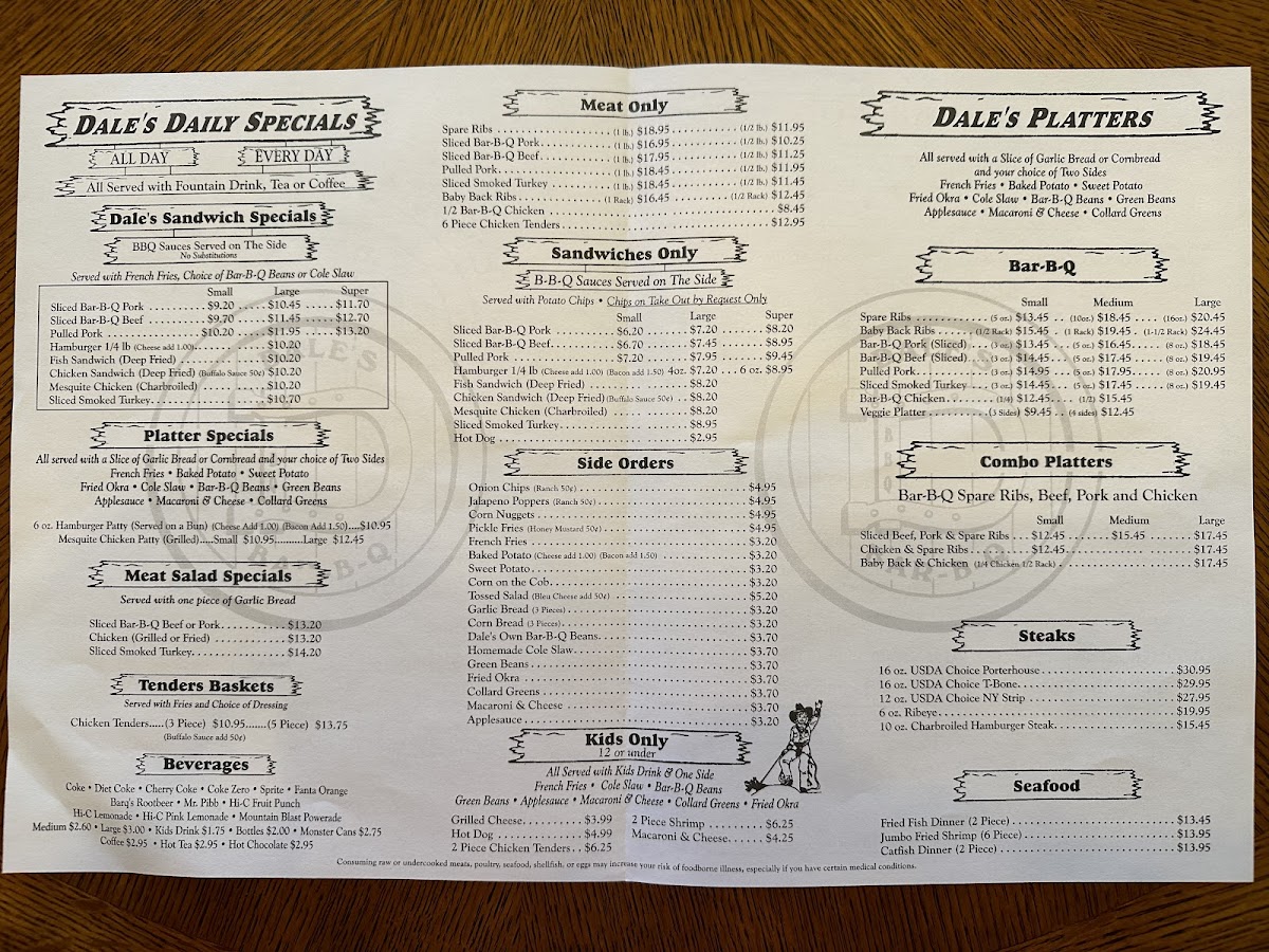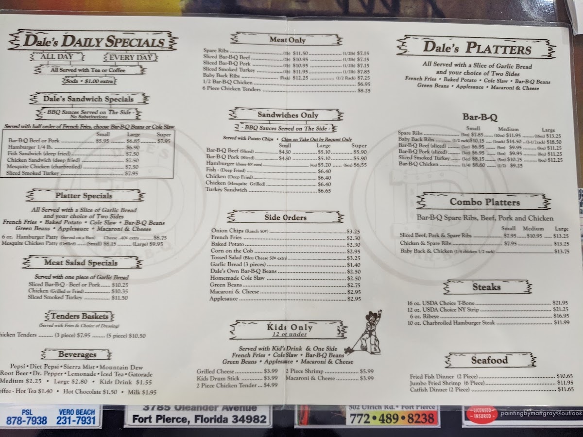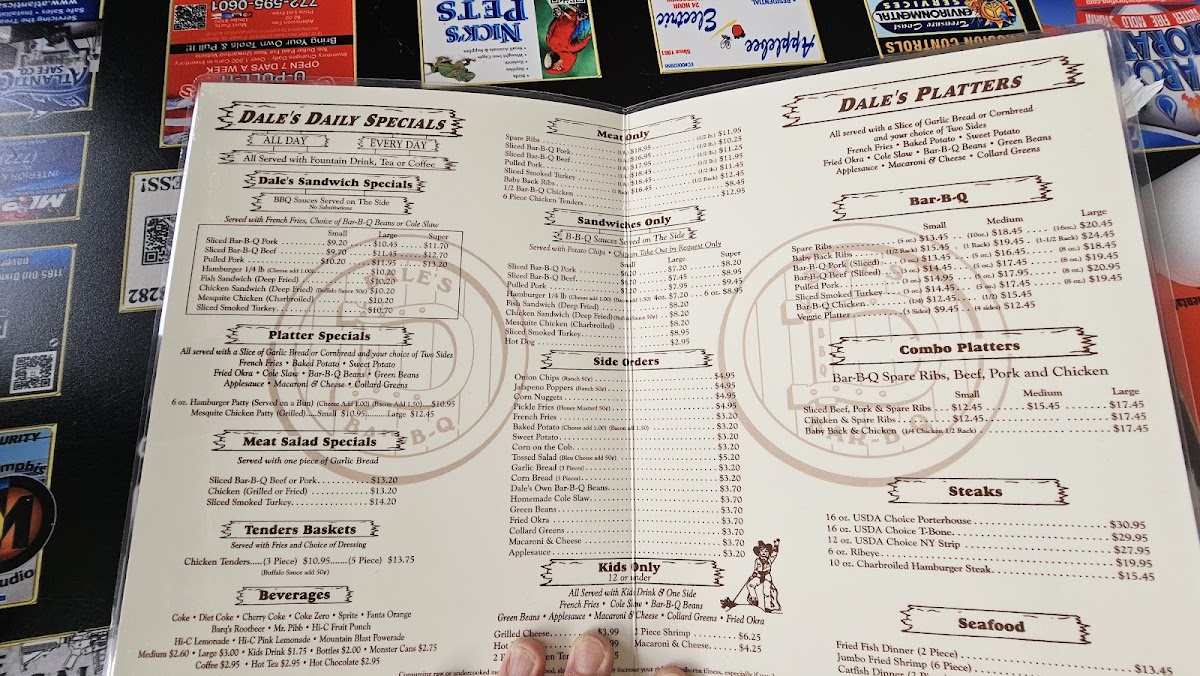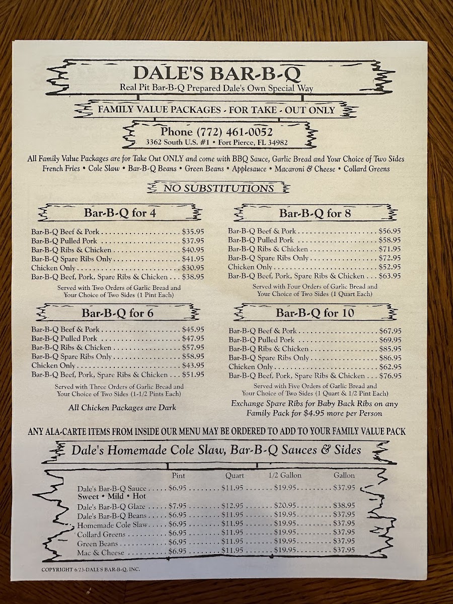 Welcome to Dale's BBQ South, a barbecue gem located in Fort Pierce, Florida. This eatery specializes in classic Southern barbecue, offering a delightful range of meat options and sides that will tantalize your taste buds. From 1-pound BBQ spare ribs to sliced smoked turkey, the menu is a meat lover’s dream. Their chicken tenders come in generous portions, catering to both small and hearty appetites.